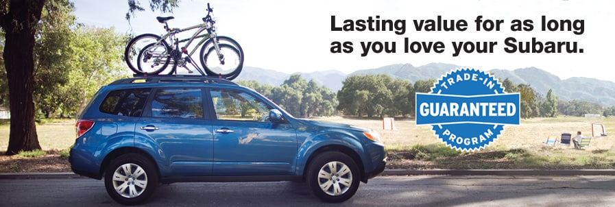 *Guaranteed Trade-In Program Value may be combined with other offers unless specifically excluded. Customer must take delivery of a new previously untitled later model year Subaru vehicle from a participating dealer inventory by the value expiration date. The new Subaru vehicle must be at least one model year newer than the trade-in vehicle. Only one trade-in offer per new Subaru vehicle purchased. Current GTP Values are available for 6 years from the original vehicle warranty start date. Trade-in values are updated monthly. The trade-in value is what owners can expect to receive from a dealership for a trade-in vehicle with standard manufacturer's equipment and a good condition rating. Vehicle values are based on the vehicle conforming to stated condition and mileage criteria found in the "Rules and Eligibility" section.